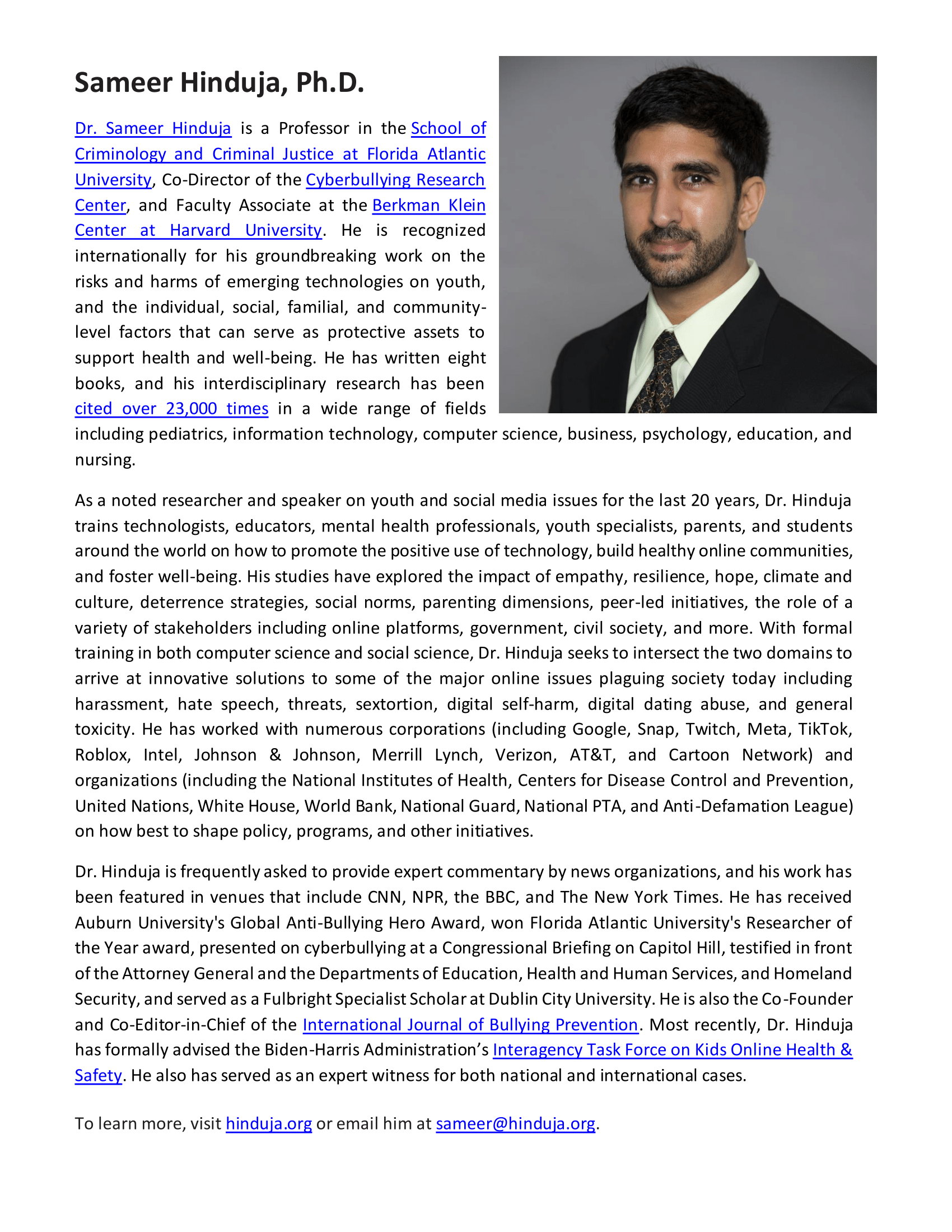 Dr. Sameer Hinduja is a Professor in the School of Criminology and Criminal Justice at Florida Atlantic University, Co-Director of the Cyberbullying Research Center, and Faculty Associate at the Berkman Klein Center at Harvard University. He is recognized internationally for his groundbreaking work on the risks and harms of emerging technologies on populations of youth, and the individual, social, familial, and community-level factors that can serve as protective assets. He has written eight books, and his interdisciplinary research has been cited over 25,000 times in a wide range of fields including pediatrics, information technology, computer science, business, psychology, education, and nursing. As a noted researcher and speaker on youth and social media issues for the last 20 years, Dr. Hinduja trains technologists, educators, mental health professionals, youth specialists, parents, and students around the world on how to promote the positive use of technology, build healthy online communities, and foster well-being. His studies have explored the impact of empathy, resilience, hope, climate and culture, deterrence strategies, social norms, parenting dimensions, peer-led initiatives, the role of a variety of stakeholders including law enforcement and online platforms, and more. Dr. Hinduja is frequently asked to provide expert commentary by news organizations, and his work has been featured in venues that include CNN, NPR, the BBC, and The New York Times. He has worked with numerous corporations (including Google, Snap, Twitch, Meta, TikTok, Intel, Johnson & Johnson, Merrill Lynch, Verizon, and Cartoon Network) and organizations (including the United Nations, the White House, the Federal Trade Commission, the Centers for Disease Control and Prevention, the World Bank, the World Economic Forum, the National Guard, the National PTA, and the Anti-Defamation League) on how best to shape policy, programs, and other initiatives. He has received Auburn University's Global Anti-Bullying Hero Award, won Florida Atlantic University's Researcher of the Year award, presented on cyberbullying at a Congressional Briefing on Capitol Hill, testified in front of the Attorney General and the Departments of Education, Health and Human Services, and Homeland Security, and served as a Fulbright Specialist Scholar at Dublin City University. Dr. Hinduja has formally advised the Biden-Harris Administration's Interagency Task Force on Kids Online Health & Safety as well as the Be Best Initiative during the first Trump Administration. Dr. Hinduja is the Co-Founder and Co-Editor-in-Chief of the International Journal of Bullying Prevention, published by Springer. He also has served as an expert witness for both national and international cases.