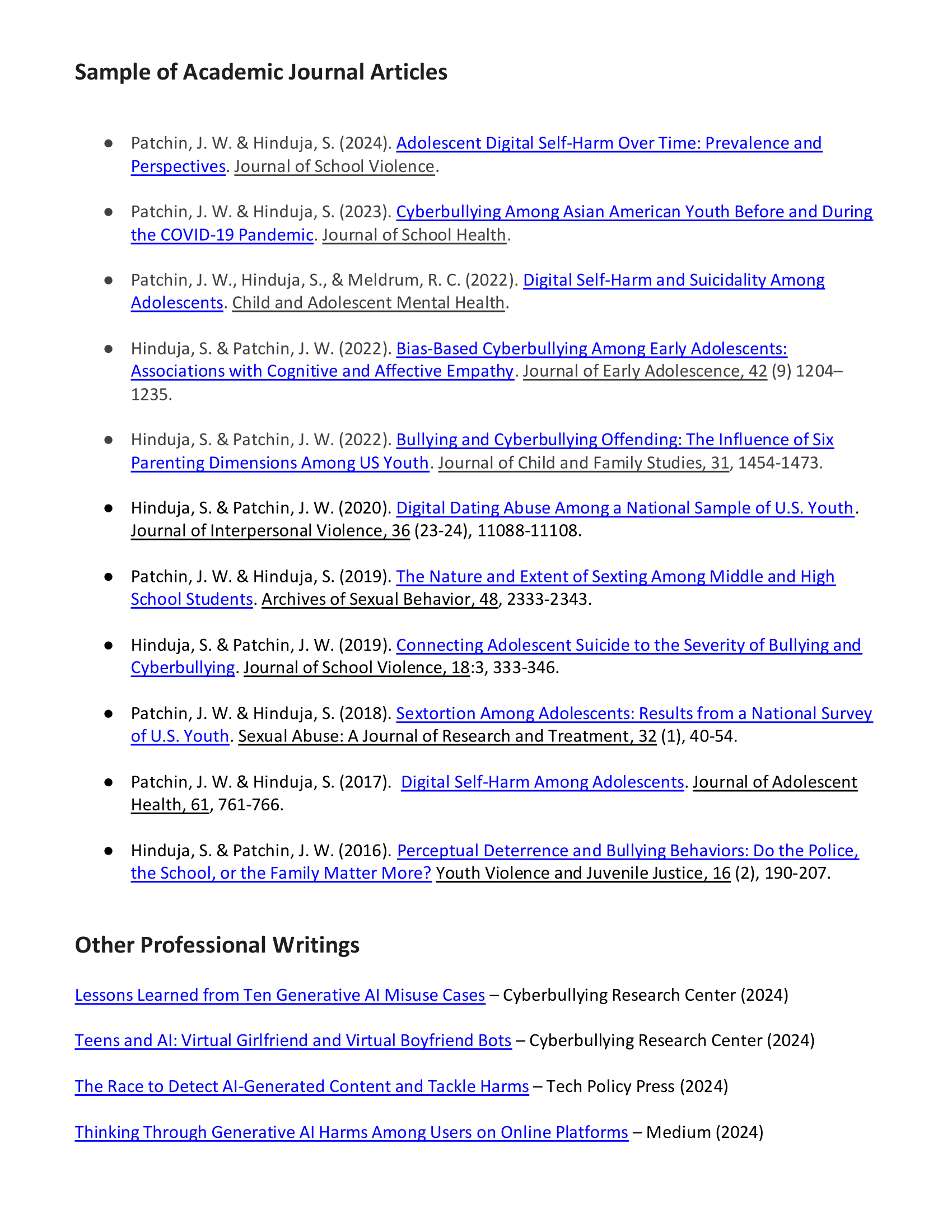 Patchin, J. W. & Hinduja, S. (2024). Adolescent Digital Self-Harm Over Time: Prevalence and Perspectives. Journal of School Violence, 23 (4), 542–554. Impact Factor: 2.4.